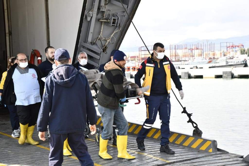 Akdeniz Bölge Komutanlığı limanına yanaşan gemideki yaralılar, hazır bulunan ambulanslara sağlık personeli tarafından bindirilerek tedavilerinin yapılabilmesi için Mersindeki hastanelere götürüldü.