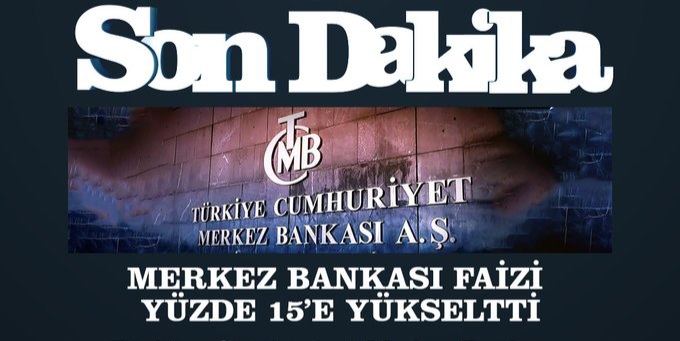 Merkez Bankası, 650 baz puan artırarak yüzde 8.5’ten yüzde 15’e yükseltti.