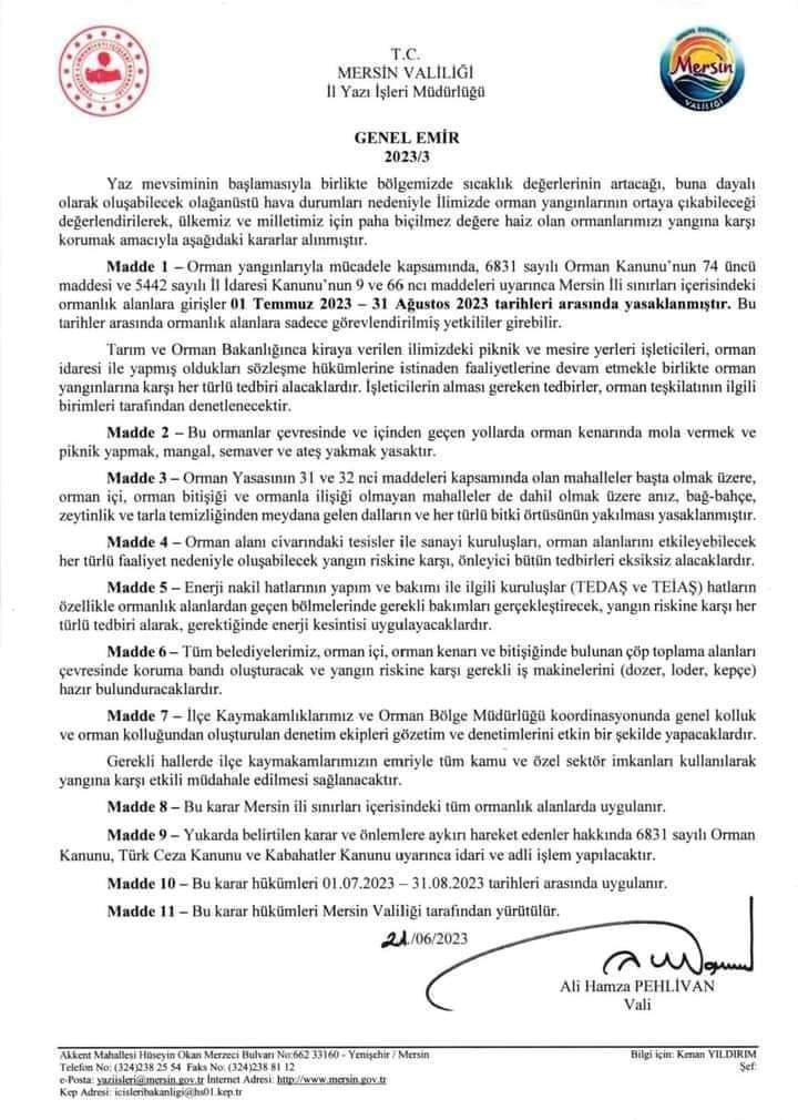 Mersin’de Ormanlık Alanlara girişler 1 Temmuz – 31 Ağustos tarihleri arası yasaklandı.