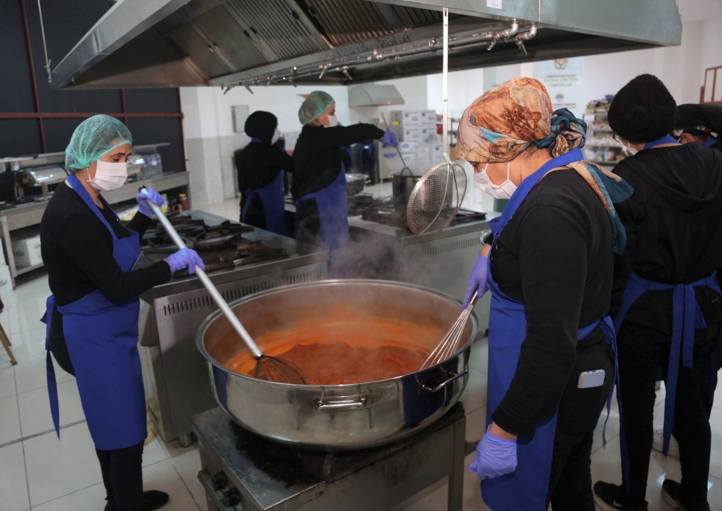 Kazanlarda özenle hazırlanan sıcak yemekler, ilçedeki sosyal tesislerde ve gönüllü vatandaşların yanında kalan depremzedelere ulaştırılıyor.